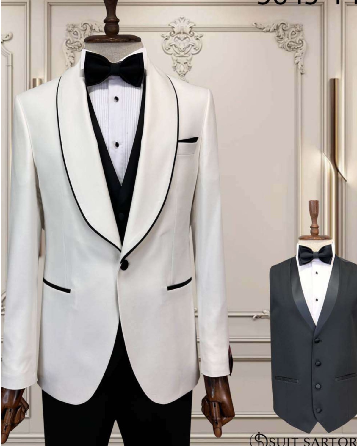 Elegant white groom tuxedo with black shawl lapel. Perfect for weddings, prom, and formal events in